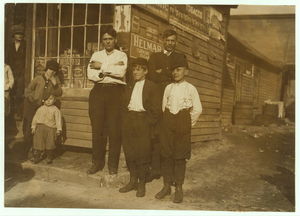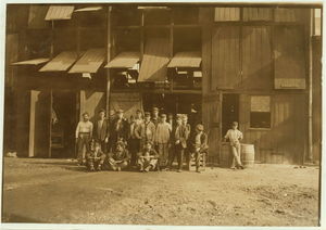 Noon-hour. Cumberland Glass Works, Bridgeton, N.J. Smallest boy in middle of front row and one on right-hand end have been in this plant four years. See also #957 to 971. Location: Bridgeton, New Jersey.