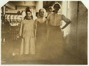 Group of 66 spinners in #7 spinning room. They were the most openly profane and vulgar I have ever encountered in mill work. Florida St. Cyr (smallest girl), 24 Cray St. Location: Chicopee, Massachusetts.