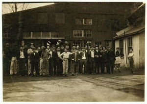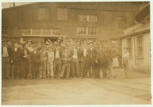 Noon-hour. Cumberland Glass Works, Brigetonsic, N.J. Smallest boy in middle of front row and one on right-hand end have been in this pant four years. See also photos #957 to 971. Location: Bridgeton, New Jersey.