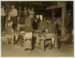 Scene in Cumberland Glass Works, Bridgeton, N.J. A young "holding-mold-boy" on left of photo and young "carrying-in-boy" in middle distance. Location: Bridgeton, New Jersey.