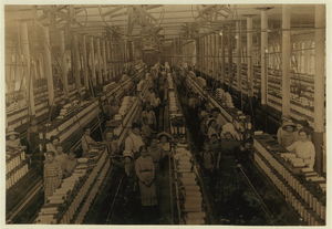 Interior of Magnolia (Miss.) Cotton Mills spinning room. See the little ones scattered through the mill. All work. See also other Magnolia photos and labels. Location: Magnolia, Mississippi.