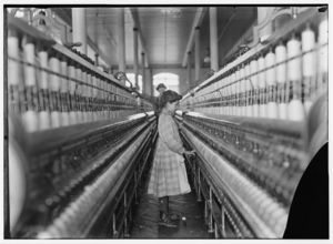 Spinner in Lancaster Cotton Mills, S.C. Many more as small as she. Location: Lancaster, South Carolina.