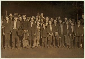 6:00 P.M. Flashlight photo of part of force going home. Sibley Mfg. Co. Augusta, Ga. Some of the smallest boys said been in mill from one to several yrs. Jan. 15, 1909. Location: Augusta, Georgia.