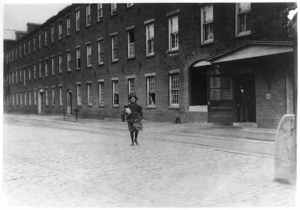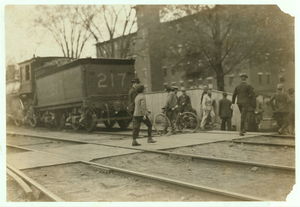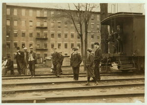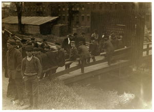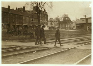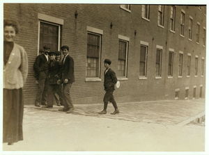 Going to dinner from Great Falls Mfg. Co., Somersworth, N.H. May 18, 1909. A number of young boys and girls work regularly (during school hours) as "helpers" to mother, father or sister. Location: Somersworth, New Hampshire.