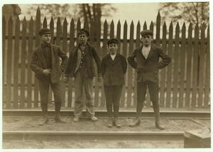 Boys working in Great Falls Mfg. Co., Somersworth, N.H. Smallest boy is Joseph Lessard, #9 Central St. Vincent Hennessey, 12 Portland St. Wilfred Naddeau, 34 Depot St. Alfrod Bisson, 10 South Street. Location: Somersworth, New Hampshire.