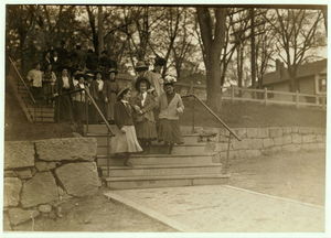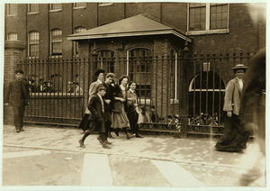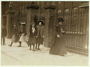 Young girls going to work in Mill No. 1 Cocheco Mfg. Co., Dover, N.H. I saw them go to work regularly, day after day. May 17, 1909--Noon. Location: Dover, New Hampshire.