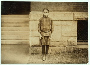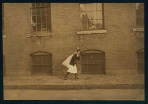 5 minutes to 9 A.M. Eleven-year-old girl running home with a twenty-pound load of garter buttons for home-work. Trying not to be late for school. (See also Report.) Location: Worcester, Massachusetts.