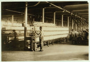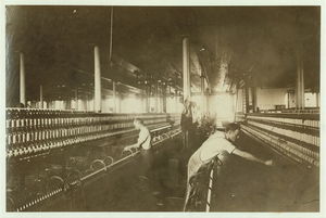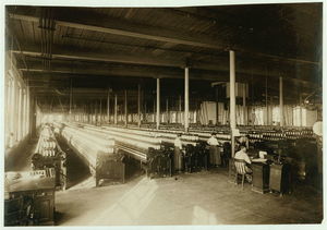 (For Child Welfare Exhibit 1912-13.) View in Mule Room, Lonsdale Cotton Mills, Lonsdale, R.I. Nov. 22/12. Location: Lonsdale, Rhode Island.