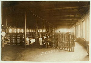 (For Child Welfare Exhibit 1912-13.) View of warping room, Lonsdale, R.I. Mills. Location: Lonsdale, Rhode Island.