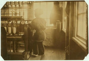 (For Child Welfare Exhibit 1912-13.) Cotton-mill employee using seat that is on the end of her machine. Pawtucket, R.I. Location: Pawtucket, Rhode Island.
