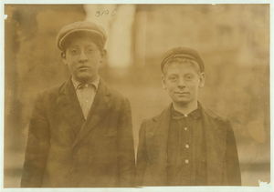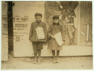 Isidor, 8 years old (on left) and Joe, 10 years old (on right) sell until 9 P.M. every night, and earn 75 cents and 35 cents a week, respectively. Location: Jersey City, New Jersey.