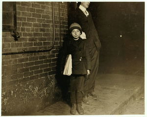 (For Child Welfare Exhibit 1912-13.) Nearly midnight, Ten year old newsboy selling in and around this saloon near Market Square, Providence, R.I. Flash-light photo. Location: Providence, Rhode Island.