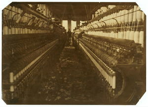(For Child Welfare Exhibit 1912-13.) View in a Pawtucket, R.I., cotton mill showing accumulation of lint on floor. The air is full of it too, but photo doesn't show it. Location: Pawtucket, Rhode Island.