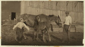 Eight-year old Jack taking care of the colt. See Hine Report, Rural Child Labor, August 1915. Location: Western Massachusetts, Massachusetts.