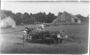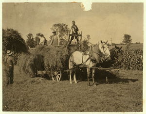 Eight-year old Jack driving load of hay. See Hine Report, Rural Child Labor, August, 1915. Location: Western Massachusetts, Massachusetts.