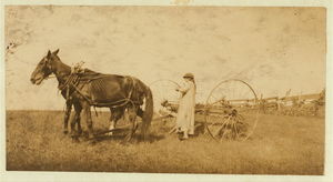 Lucy Saunders hitching the team to the horse rake. See Hine Report, Rural Child Labor, August 1915. Location: Western Massachusetts?, Massachusetts?