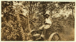Rural Accident. Twelve-year old Clinton Stewart and his mowing machine which cut off his hand. See Hine Report, August 1915.