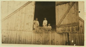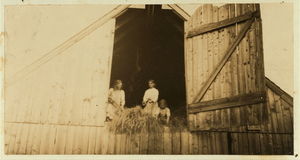 Three Saunders children, nine, eleven, and thirteen years old, mowing away the grain. See Hine Report, Rural Child Labor, August 1915.