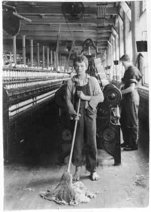 15 year old sweeper - Spinning and Spooling room - Berkshire Cotton Mills. Location: Adams, Massachusetts / Lewis W. Hine.