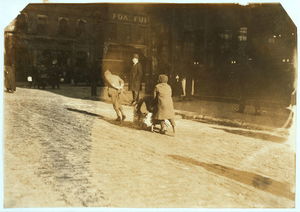 Beacon Street residence being demolished (next to State House) Young children carry the wood home. Location: Boston, Massachusetts / Lewis W. Hine.