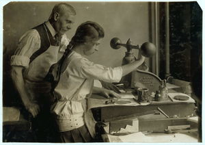 Embossing shop of Harry C. Taylor, 61 Court Street. 15-year old girl at embossing machine. Location: Boston, Massachusetts / Lewis W. Hine.