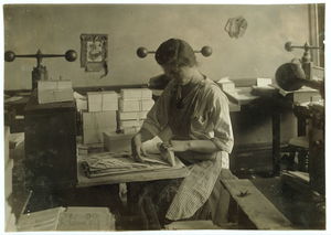 15-year old girl at her old job packing the finished envelopes. Embossing shop of Harry C. Taylor, 61 Court Street. Location: Boston, Massachusetts / Lewis W. Hine.