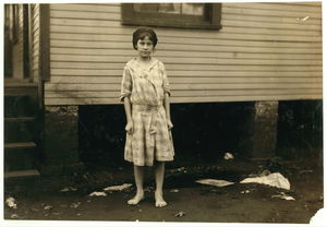 Fourteen year old spinner in a? Brazos Valley Cotton Mill at West. Violation of the law. Matty Lott runs six sides. See family group and their story. Location: West, Texas.