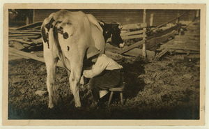 Eight-year old Jack milking the cows. See Hine Report, Rural Child Labor, August 1915. Location: Western Massachusetts, Massachusetts