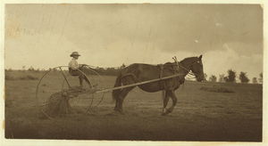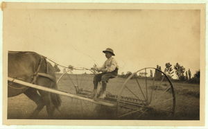 Eight-year old Jack driving horse rake. A small boy has difficulty keeping his seat on rough ground and this work is more or less dangerous. See Hine Report, Rural Child Labor, August 1915. Location: Western Massachusetts, Massachusetts