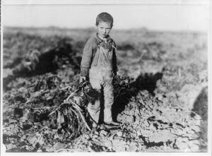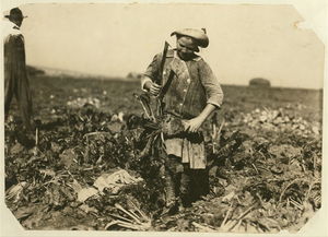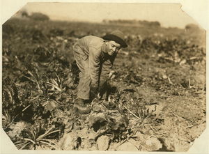 Six-year old Jo, pulling beets for his parents on a farm near Sterling, Colo. This is very heavy work for such little ones, but many do it. Location: Sterling vicinity, Colorado / Photo by Hine, Oct. 21/15.