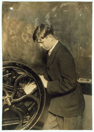John Megna - Italian - 16 yrs. 75 Mt. Hope Ave. Iron Worker - Sweeper. Carving class at King Philip Settlement. Location: Fall River, Massachusetts / Lewis W. Hine.