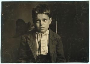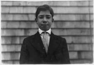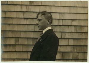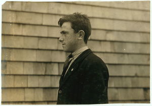 Manuel Ferreira - Portuguese - 15 yrs. 27 Whitter St. Sweeper - Fall River Iron Works. In Sunday clothes. Carving class at King Philip Settlement. Location: Fall River, Massachusetts / Lewis W. Hine.