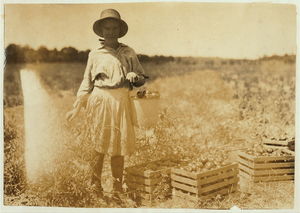 10-year old girl picking tomatoes on farm of W.T. Hill. Location: Cabool, Missouri / Lewis W. Hine.