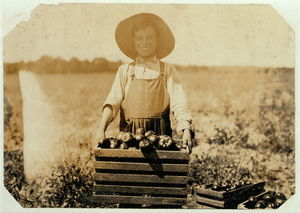 12-year old boy carrying heavy crate of tomatoes on farm of W.T. Hill. He has been earning $1.25 a day steady all Summer. Location: Cabool, Missouri / Lewis W. Hine.