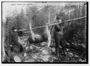 Men carrying shot deer on pole, Canada