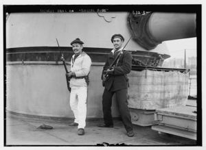 Two sailors in bayonet drill aboard deck of Amiral Aube, French ship