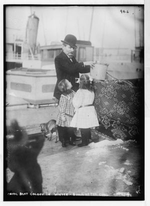 Canal boat colony (gentleman, two children) in winter, going after coral