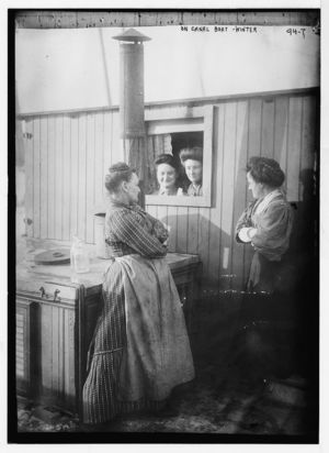 Women on canal boat, in winter