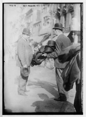 Hat Peddler and prospective buyer, on sidewalk, New York