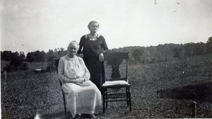 Alice Hedger Moore and her sister Ruth Florence Hedger Maurer posing on the family homestead, lik...