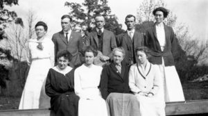 Alice and children and spouses "up home" at the Moore homestead around 1923, perhaps a little bit...