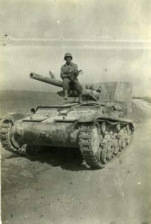 Carl Birdwhistell takes a photo of one of his buddies on an abandoned tank gun. Likely in Africa ...
