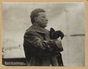 Col. Roosevelt saluting while passing through line of Norwegian battleships, the bands playing th...