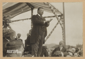 Theodore Roosevelt speaking to a crowd from a raised platform