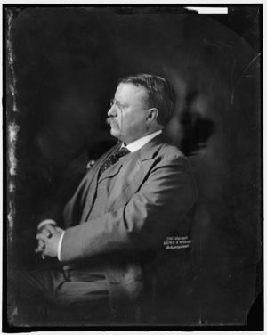Theodore Roosevelt, 26th US President, full length, seated in chair on lawn, facing slightly righ...