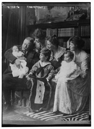 Pres. and Mrs. Theodore Roosevelt seated on lawn, surrounded by their family; 1903. From left to ...