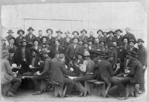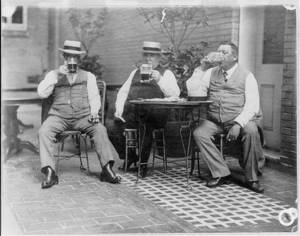 Three Democratic bosses of Maryland seated and drinking from mugs - L. to R.: George(?) N. Lewis, John S. Kelly, John J. Mahon