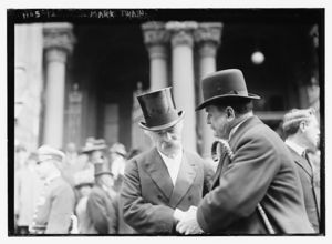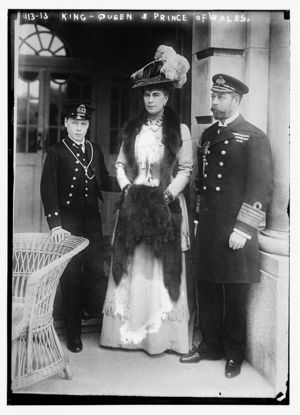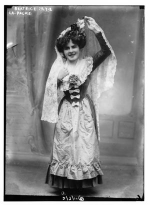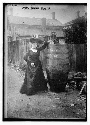 Mrs. Anna Edson standing next to huge barrel upon which is written "Queen of the Mist" and upon which is sitting a cat