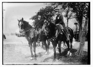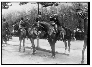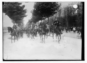 T.R. Theodore Roosevelt reviewing troops in Vincennes. Gen. Dalstein on right