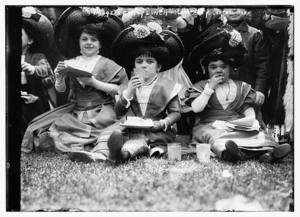 Midgets eating lunch - May party - Central Park. Three midgets sitting on the grass.